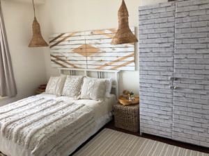 在澳門租住過的公寓也是她的畫布。每次搬家,她都會發揮想像力和創造力,嘗試新想法和不同材料的新用途。她鐘愛的配色方案是白色、黃色和奶油色——會使小空間感覺更寬敞。起居室和臥室都有獨特的海灘氛圍(也許能讓她回想起在普吉島的日子?)……木框鏡子,竹百葉窗,貝殼和串珠容器,藤製的筐、邊桌和扶手椅。她將其貌不揚的木板開發出了種種妙用——改造成白色咖啡桌,放在宜家邊板上,用作客房床的底座,甚至掛在主臥室牆上作裝飾。