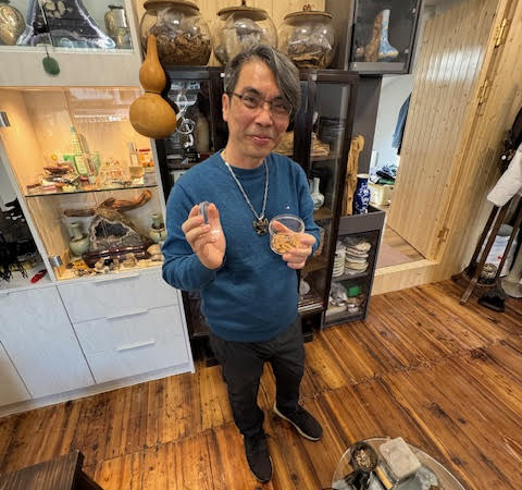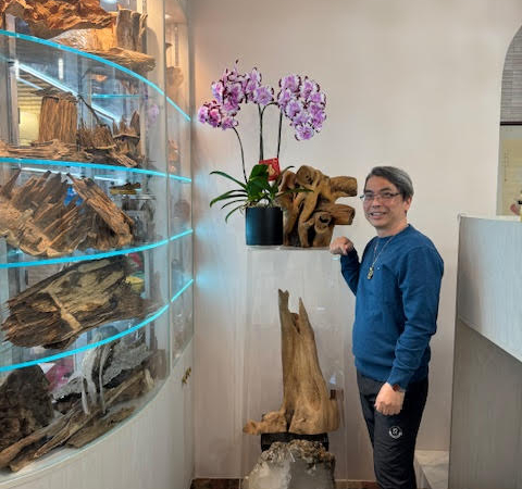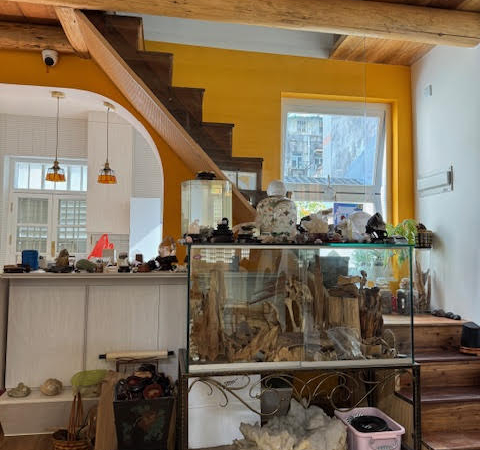 「我在澳門大學讀書時,主修傳播和市場營銷。畢業後, 我的第一份亦是最後一份工作,是在澳門賽馬會,全職在會員 部工作,兼任賽事完場照片評判。工作六年後,我離開馬會, 追隨興趣和熱情開設了一間專營晶石的店舖。第一間店開設於 26年前,是澳門歷史最悠久的晶石店之一。當時城中有八間晶石店舖,現在只有兩間存活下來,我的店就是當中之一。」