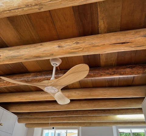 為了確保整體設計風格的統一,一樓地面特別選用德國進 口的淺色原木地板。而天花板的木材則全部採用來自馬來西亞 的舊木料,這些木料表面自然氧化形成的銅綠色澤,散發著獨 特的歲月質感。 「我們保留了兩根原來的橫梁,其他的都是新的。」 廚房的鋼框窗戶和手工折疊門都是原始物件,完好地保存了下來。