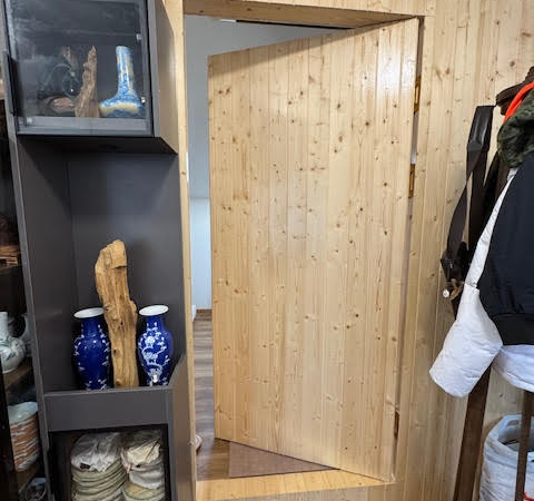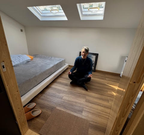 這區域的地板設計別具匠心:裝修時先鋪設了厚實的新松木作為底層,再精心覆蓋上原有的古老雪松木地板。這些雪松木地板歷經歲月淬鍊,獨特的木紋與古銅色澤令人嘆為觀止。 與之形成鮮明對比的,是採用淺色桑拿木打造的室內隔板與房門。推開這扇門,是一個抬高的平台——這裡既是一個私密的鞋履收納區,也可作為禪修冥想的靜心之所,甚至能容納一張矮床。兩扇現代化的天窗將溫暖的自然光引入室內。