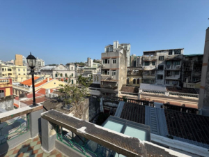 繼續向上,樓梯通往屋頂花園,這裡不僅有更多綠植空 間,還設有休閒區,可360度飽覽望德堂區的絕美風光。作為澳門保存最完好的歷史街區之一,眼前鋪滿方格瓷磚的街巷總讓人恍若置身里斯本舊城區。