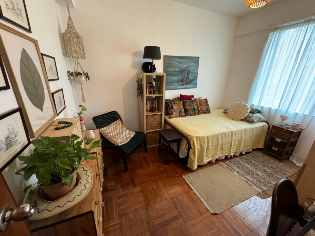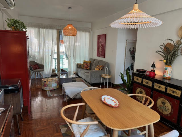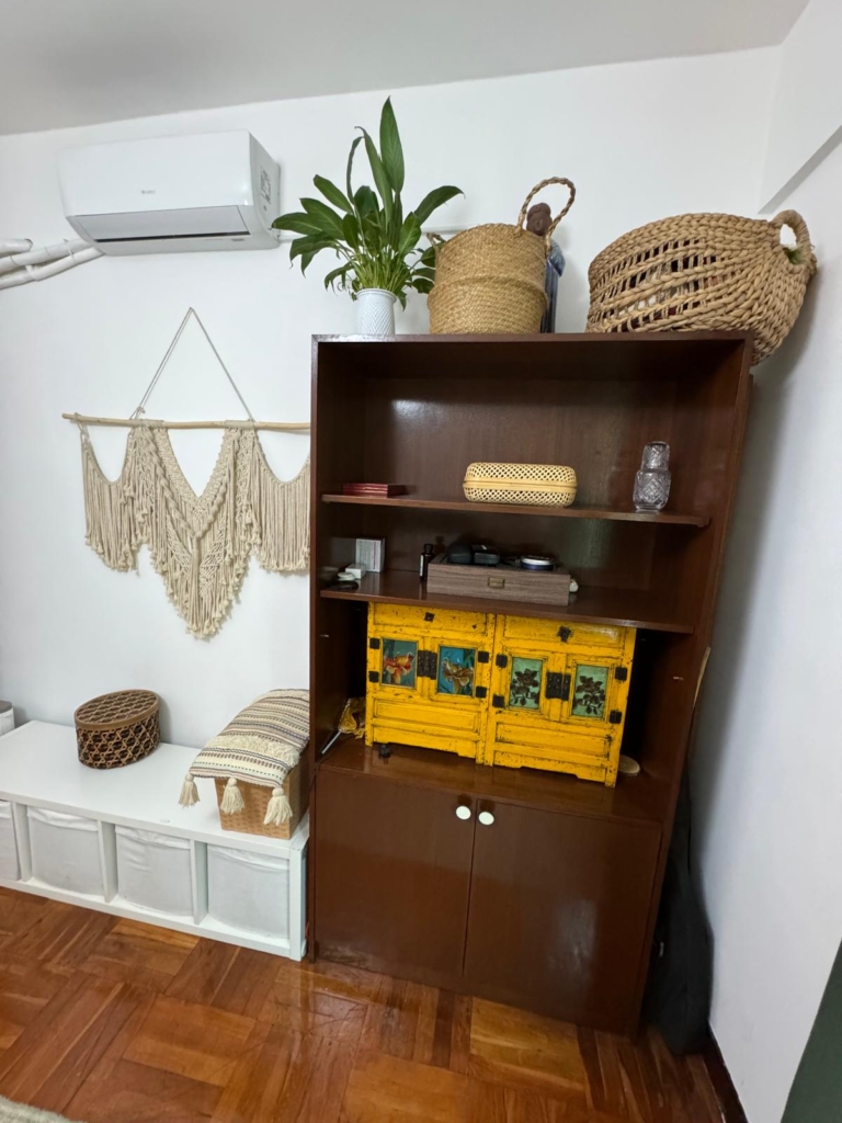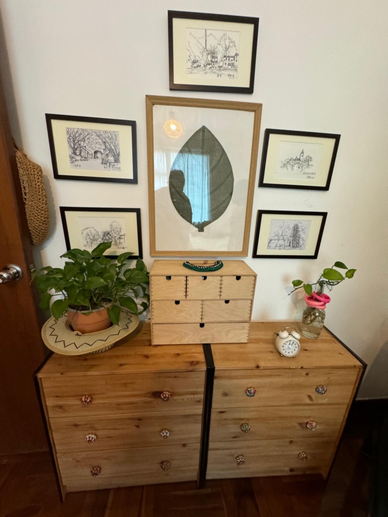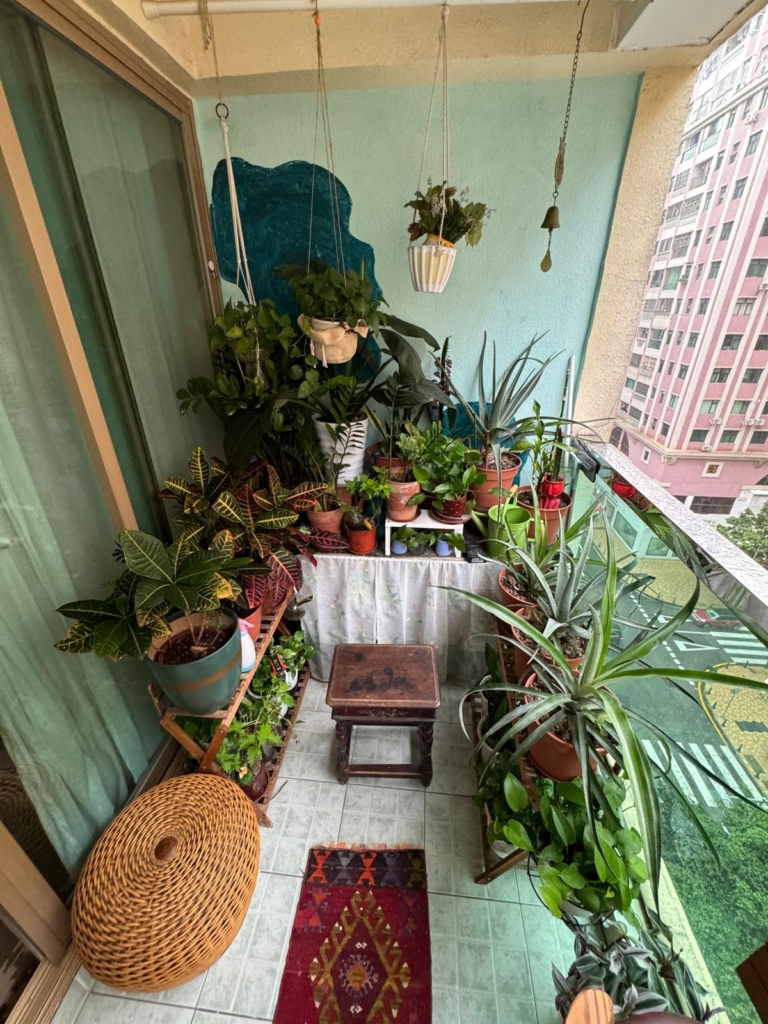 G入住後,陽臺上逐漸種滿了植物,Jocelina 開始在公寓裡擺放朋友和離開澳門的人贈送、或自己在 ByeByeZaia 上得來的寶貝,包括紅色的中式櫥櫃、古樸的漆藝中式餐具櫃以及一個紡錘桌腿的小矮桌。