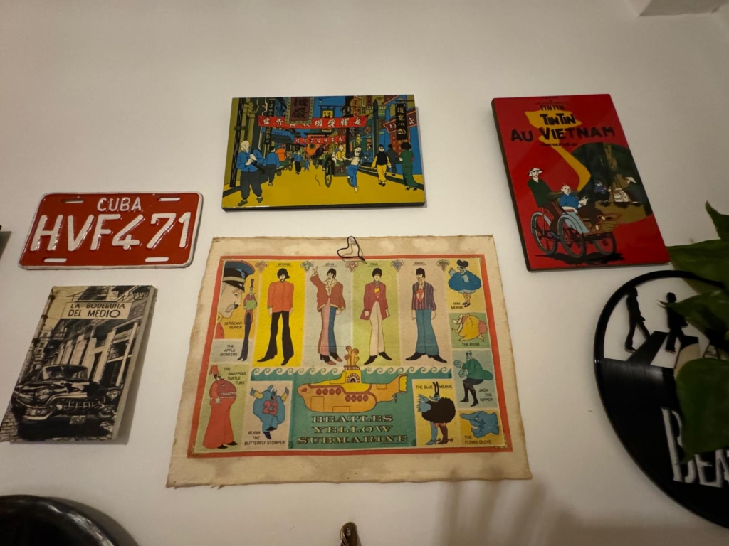 五顏六色的地氈和從旅行中收集來的Kilim地墊令房間的鑲木地板更添活力,牆壁上的飾品則融合了非洲和歐洲元素,擺放著籃子和編織飾品、才華橫溢的藝術家大嫂Jacira Monteiro 創作的抽象藝術作品,此外還有不拘一格的披頭四紀念品(「Fabio的愛! 」)、丁丁的圖片和一些裝裱好的手工編織物。