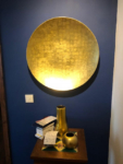 用餐區延續了公寓的優雅風格。餐桌由神臺的桌腿和玻璃檯面組成,下面是一方深藍色的西藏大地毯,飾有佛教的「卐」圖案。淡灰藍色的裝飾藝術餐椅,來自峇里島(「或者可能是印度尼西亞」)的壁掛,還有Michel以前從大三巴下小巷中的古董店中淘來的超大舊框架鏡子和配套柚木空格櫃一起,令整體風格更加和諧。