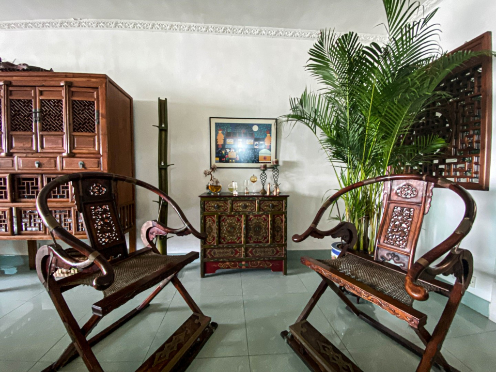 沙發和扶手椅是經典優雅的設計和面料,都是在澳門製造的。她的第一件中國傢具是電視櫃,也來自澳門,咖啡桌也是。 隨後是幾個大型的、漂亮的中式櫥櫃,用來存放珍貴的玻璃器皿和陶瓷收藏。Manuela從一本雜誌的圖片中得到啓發,設計了竹制餐桌和椅子,並在香港製作。