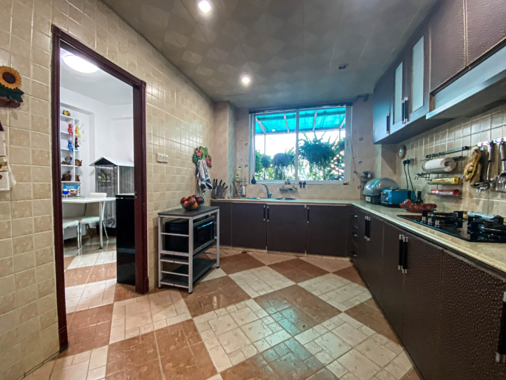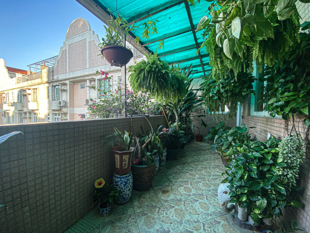 在客廳外的陽台上,風鈴在微風中叮噹作響。「這些都是我在不同地方旅行時買的。」陽台上擺滿了開花的盆栽、綠色植物和灌木,陽台是全屋的一個焦點;擺放著給鳥類的飼料和鳥池,歡迎一天中經常來訪的羽毛朋友。遠處有飛機從頭頂掠過,從澳門機場入境和出境,在更遠的地平線上,在一個晴朗的日子,人們可以看到飛機進出香港機場。